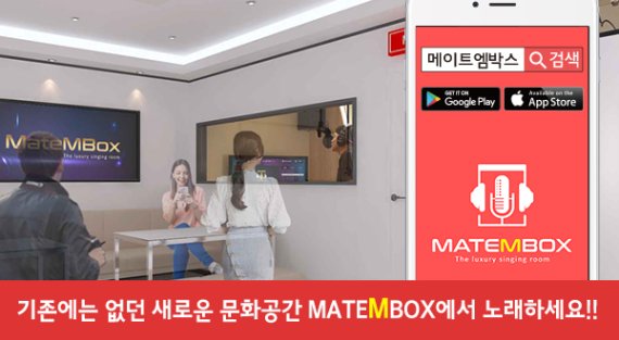 스튜디오 형 노래방인 ‘메이트엠박스’(MATEMBOX)는 일반노래방, 코인노래방과 달리 IT 기술을 이용해 SNS와 연동할 수 있고 고급 인테리어를 갖춘 차세대 노래방을 표방한다.